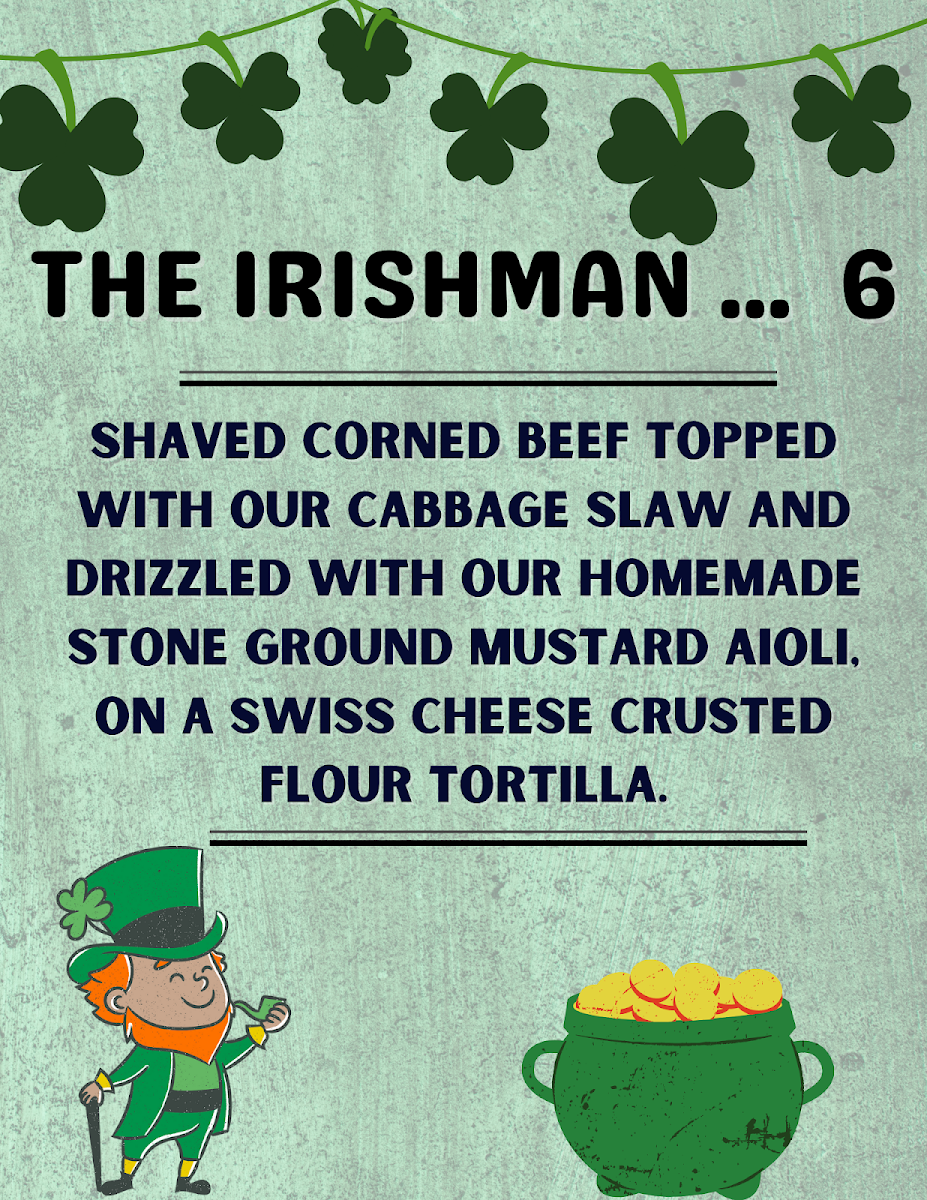 Crispy chicken tenderloin, tossed in buffalo sauce, topped with a carrot & celery slaw with blue cheese dressing (Cheese Crusted Flour Tortilla)