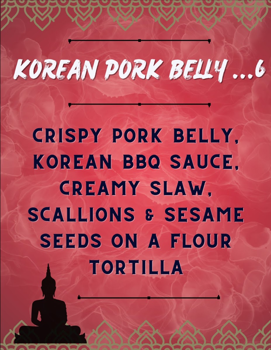 Korean Pork Belly Crispy Pork Belly, Korean BBQ Sauce, Scallions & Sesame Seeds on a Flour Tortilla